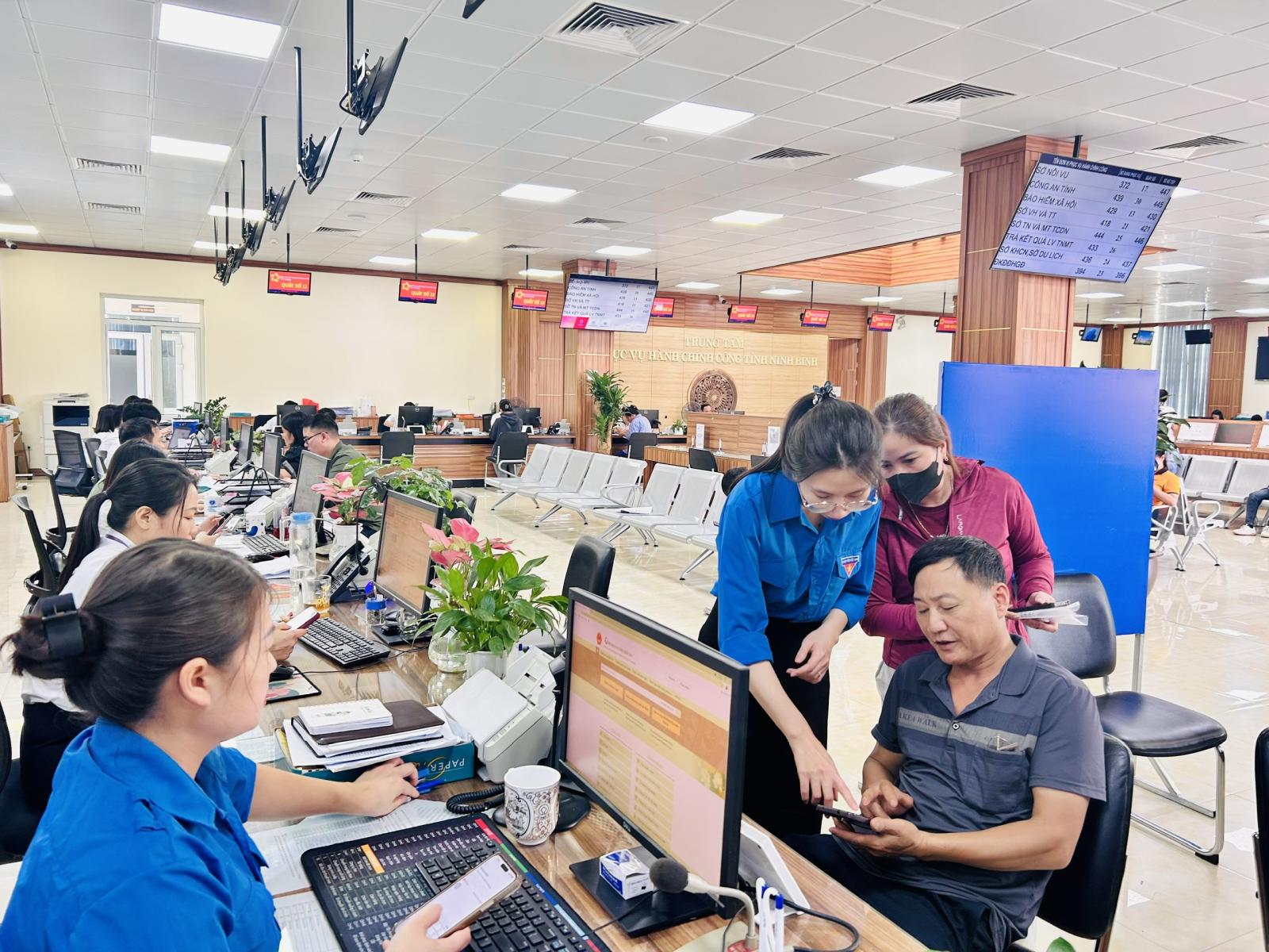 Thực hiện Kế hoạch của UBND tỉnh Ninh Bình về việc tổ chức Ngày Chuyển đổi số Quốc gia (10/10) năm 2025 trên địa bàn tỉnh Ninh Bình và Văn bản của Sở Khoa học và Công nghệ về việc đẩy mạnh tuyên truyền hưởng ứng Ngày Chuyển đổi số Quốc gia (10/10) năm 2025 trên địa bàn tỉnh Ninh Bình với chủ đề “Chuyển đổi số: nhanh hơn, hiệu quả hơn, gần dân hơn” Trung tâm Phục vụ hành chính công tỉnh phối hợp Đoàn thanh niên chi đoàn Văn phòng UBND tỉnh triển khai các hoạt động hỗ trợ, hướng dẫn người dân, doanh nghiệp và tổ chức thực hiện nộp hồ sơ trực tuyến. Triển khai thực hiện theo hướng thiết thực, hiệu quả, tiết kiệm, tránh hình thức; đồng thời gắn kết chặt chẽ với nhiệm vụ chuyển đổi số của từng địa phương, đơn vị, hướng tới mục tiêu tạo sức lan tỏa sâu rộng và dễ tiếp cận đến mọi tầng lớp nhân dân. Đồng thời, phổ biến cách thức khai thác, sử dụng các ứng dụng số thuộc hệ thống chính quyền số, kinh tế số, xã hội số phù hợp người dân, doanh nghiệp hiện nay và một số kiến thức cơ bản về đảm bảo an toàn thông tin mạng.